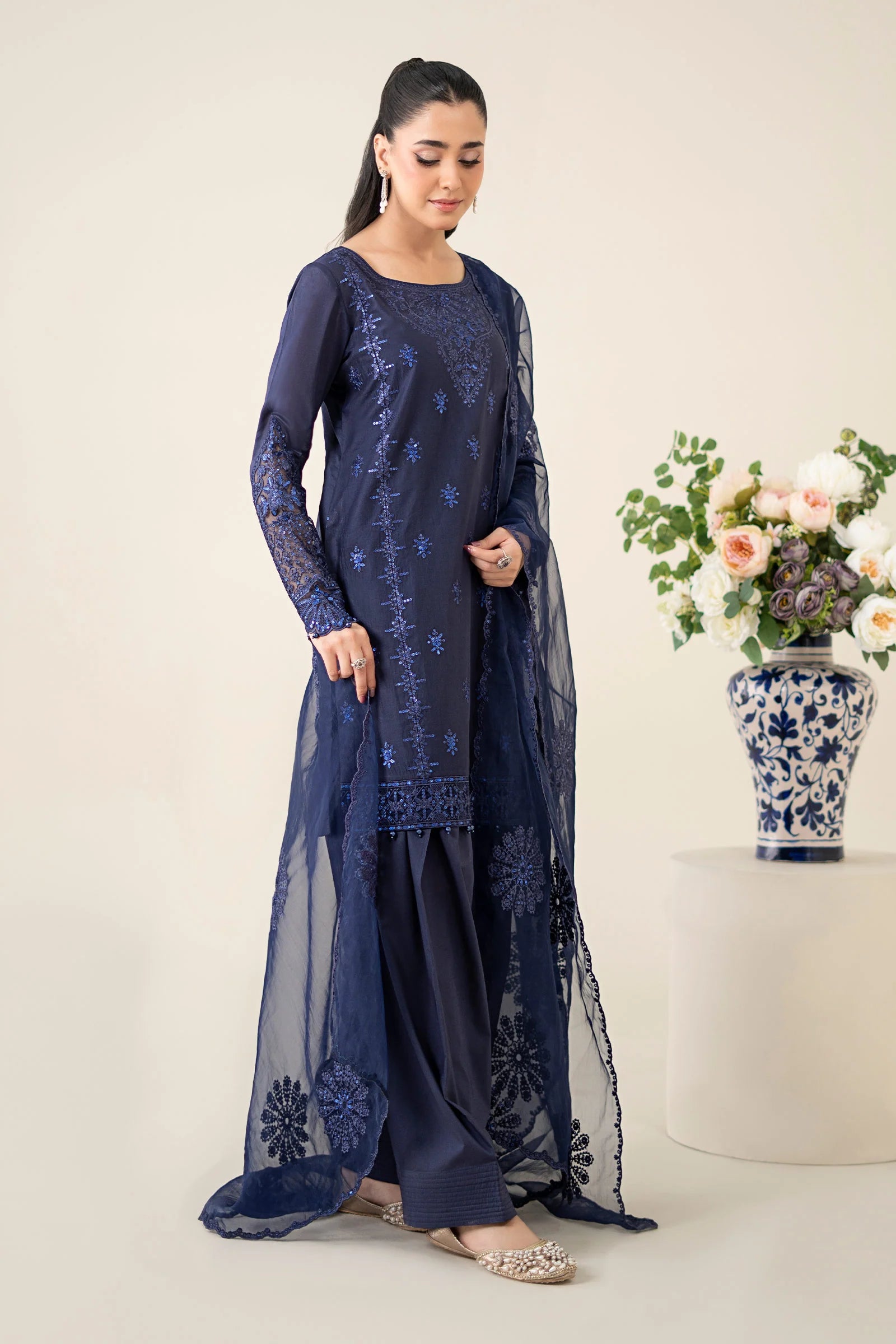 Make a statement with our three-piece embroidered ensemble in blue and off-white featuring a dobby shirt paired with cotton trousers and a printed bemberg tissue dupatta.